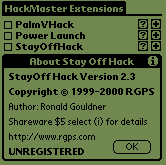 The hack immediatly shuts the Palm Computing Device off after it is awakened by the power, contrast or hardware application buttons. This is being done to prevent various cases that press on these buttons from killing the batteries. This Hack is intended for devices running a version of PalmOS that is older that PalmOS 4.0 if you have PalmOS version 4.0 or greater than try the stand alone application StayOff which does not require HackMaster. StayOffHack has a preferences panel to allow you to configure which of these buttons StayOffHack should act on so you have complete conrol over how StayOffHack works.If you enable the "PowerButton StayOff" feature it will require you to first press and hold the page-down or Contrast key before pressing the Power Button to wake your Palm Device. It's a nice way of keeping people from turning on your Palm Device as well ;-)The contrast button option was added because some PalmV/Vx devices have a unique problem in which the contrast button wakes the device and most PalmV/Vx devices will wake if the contrast button is held for 60 seconds.