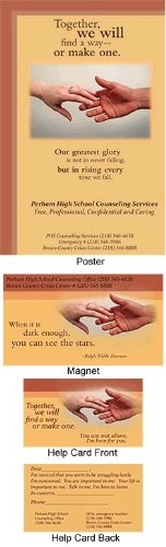 Even before an adolescent starts experiencing depression or suicidal ideation, give them the tools they need to understand what is occurring, and influence them in a way that will leave a lasting impression if they do consider suicide as an option. An impression that will tell them not to act on those thoughts or feelings, but that help is available and suicide is permanent answer to a temporary problem.The program, “Together We Will Find a Way or Make One” does just this. This program is a multi media interactive PowerPoint that educates on youth/young adults on depression and suicide prevention. It is developed to educate youth, college students, and the educators, counselors, and many other professionals that work with our youth and young adults. It’s content involves the prevalence and reason for concern, warning signs, risk factors for suicide, specifically what to say, how to intervene and why NOT to choose suicide. The content is powerful; including 45 slides, music, video clips, suicide survivor’s stories, and also the devastating effects choosing suicide has on family and friends. It provides hope for those struggling, influencing them to seek help before they act and assists those around them to notice signs and intervene. In these ways, we have the potential to reduce the number of youth suicides. Included is a detailed discussion guide. Additionally included is a complete program campaign to institute in you school, agency or building. It offers beautifully designed graphics combined with powerful messages. The packages include posters (5 different designs), magnets, and wallet cards that are personalized to list your resources--where to go for help. They are designed to encourage those feeling depressed or suicidal to seek help, and those who notice the warning signs to reach out.