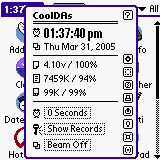Now, CoolDAs is a shareware, you can use it free. But if you wish to express your appreciation for my work, and hope I can continue developing and supporting it over the years, please buy it. Thanks! Main Features: 1. Show current time, date 2. Show current battery information; 3. Show current free size & percentage of RAM; 4. Show free/total dynamic/storage memory, max dynamic chunk, max storage chunk 5. Show current free size & percentage of the first/second card 6. Lock & Power off palm; 7. Power off palm; 8. Toggle the state of back light; 9. Soft-Reset palm; 10. Set Auto off time; 11. Change current privacy; 12. Turn on/off beam receiving; 13. Set palm valume and turn on/off alarm vibrate/led; 14. Quick HotSync; 15. Launch NetConnect DA if it presents, else Go to net preference and back to previous app; 16. Toggle ture on/off bluetooth if BtToggle presents, else go to bluetooth panel and back to previous app; 17. Quit to launcher 18. If you use special version, you can get "Go And Back" launcher(go to app and back previous app after quit the app) on OS5 device or get a normal launcher on OS4 or below Notes: The CoolDAs is a da application, so you should use a DA launcher to launch it!!
